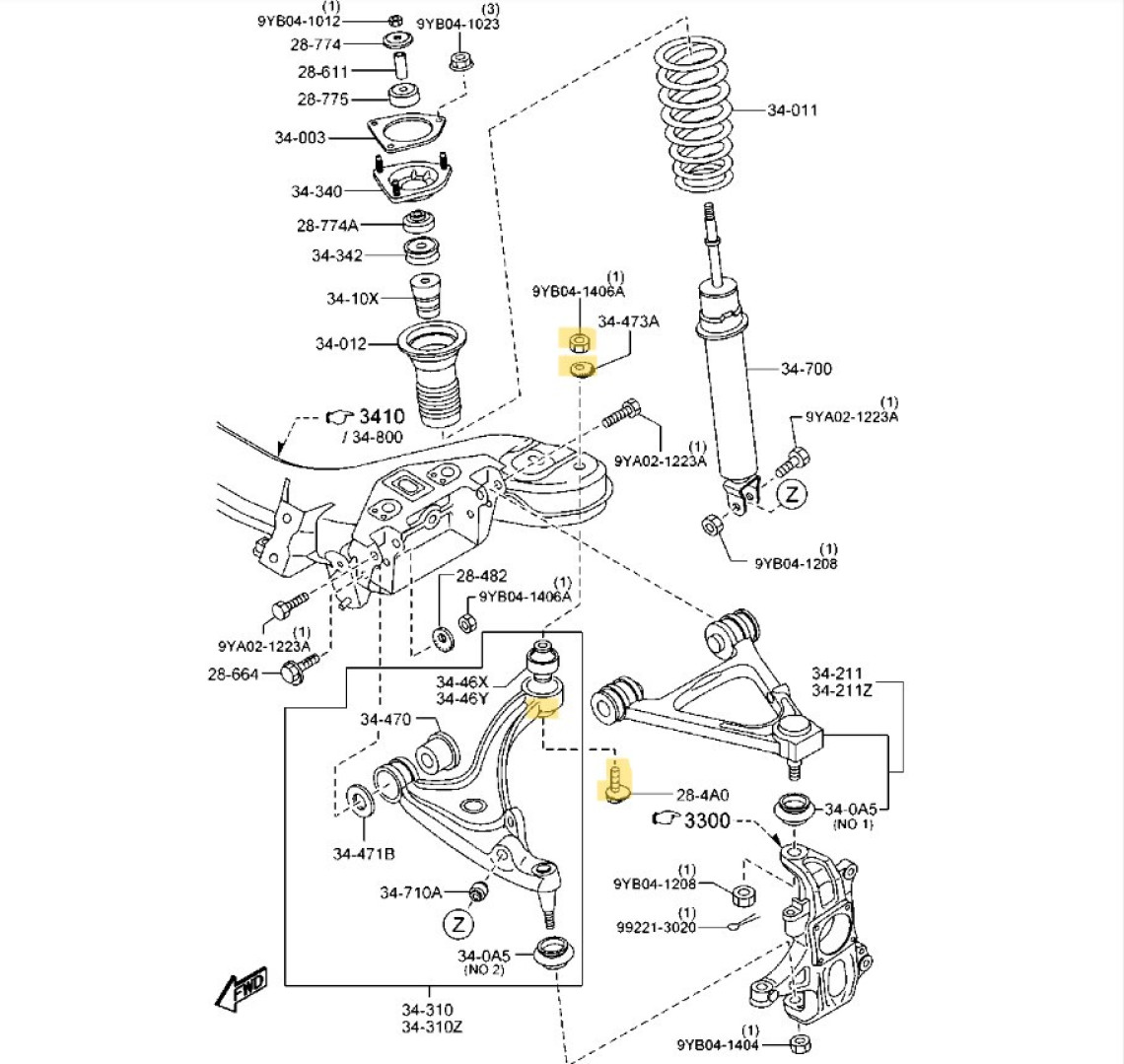Genuine Mazda Part. Alignment bolt set - Front lower arm rear bush - NC models (Mazda parts reference: bolt F1513466Z, nut 9YB041406A & cam washer F15134473)