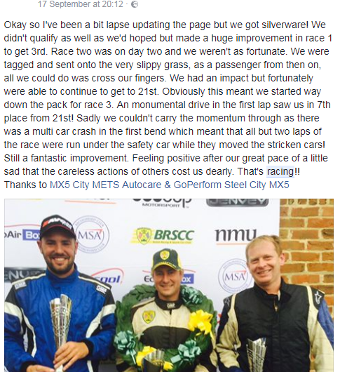This weekend just gone (16th-17th of September 2017) was a wet one indeed and was a bit of a struggle for most drivers taking part. Jonathan came home with a podium finish but not without difficulty .